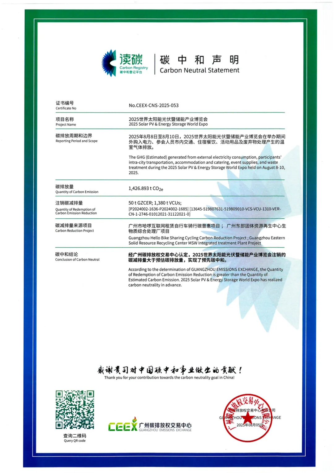 作为行业“碳中和认证标杆展会”,本届盛会不仅延续往届专业底蕴,更将绿色发展理念贯穿全程,致力于打造“零碳展会”新典范。回望2025年展会,我们已通过广州碳排放权交易中心严苛认证,基于1,426.893t CO₂e的精准碳核算,成功注销50t GZCER与1,380t VCUs碳减排量,实现预先碳中和。这一成就源于我们对展会全流程的精细化碳管控——从外购电力、参会交通、住宿餐饮,到活动物资与废弃物处理,每一个环节均践行低碳理念,并联动哈啰骑行碳普惠项目与广州东部固废资源再生中心项目,真正将“绿色展会”从倡议转化为可量化、可追溯、可认证的行动。这不仅为行业树立了绿色会展标杆,更积极响应国家“推动各类活动绿色低碳转型”的政策号召。