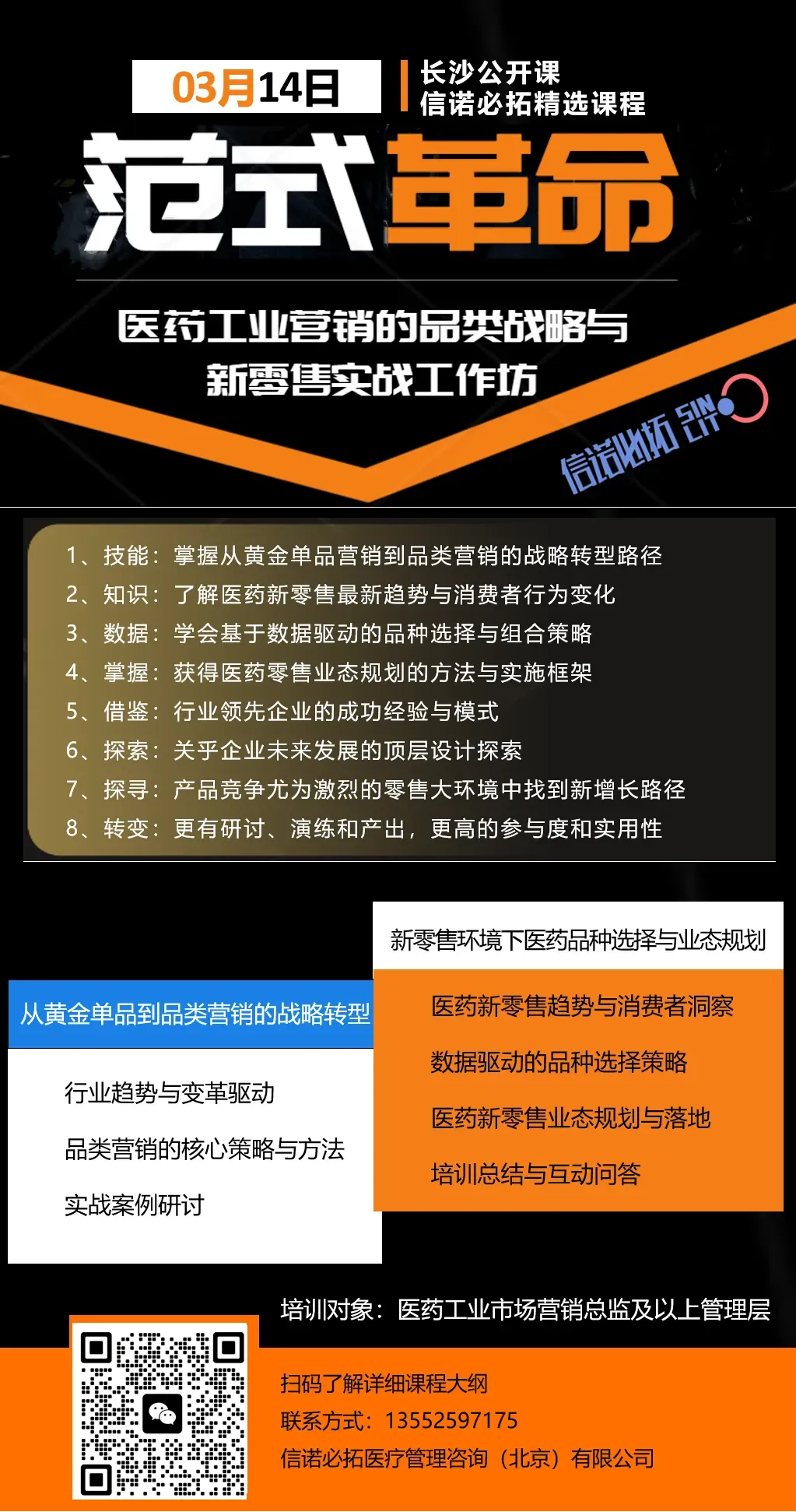 3月14日,信诺必拓「范式革命:医药工业营销的品类战略与新零售实战工作坊」 落地长沙,专为医药营销总监及以上管理层破解增长困局:这不是 “听了就忘” 的理论课,而是从战略到落地的 “实战工具箱”。