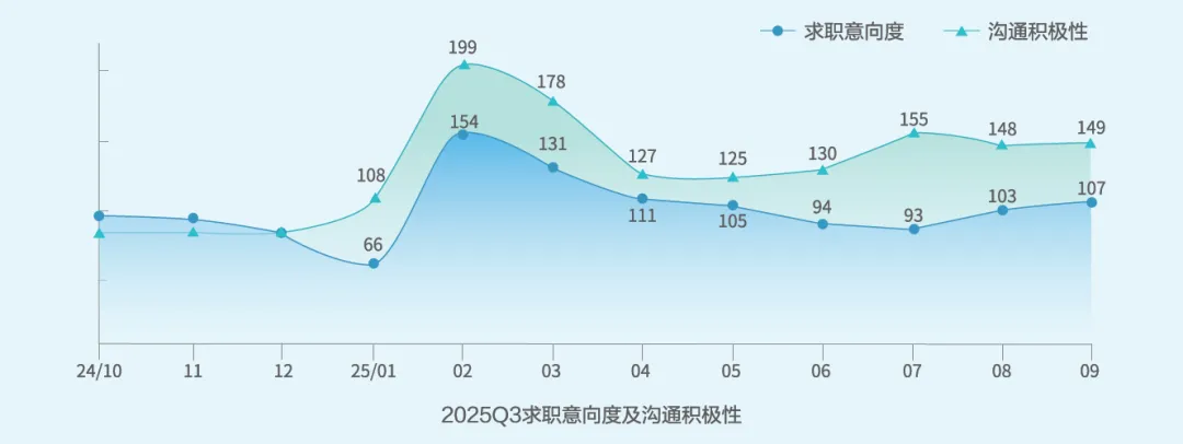 就业引力指数方面,2025年三季度网约车行业就业引力指数先升后缓,求职意向度同比增长6.2%,沟通积极性同比提升65%。报告分析认为,暑期出行旺季催热临时岗位需求,同时58同城通过持续优化岗位标签与匹配算法,将求职者精准匹配至合规且需求旺盛的运力企业,推动人岗对接与沟通意愿双双走高。