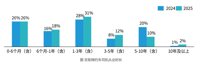 35%的司机对当前工作不满意; 计划继续从事网约车的司机比例从去年的30%下降至23%; 38%的司机计划转行,近八成将“流水低、成本高”列为首要原因,“工作时长与健康问题”紧随其后。