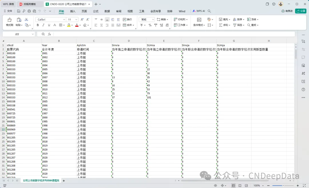 ▪ 数据说明:CNDD公司上市前数字经济专利申请情况整理了上市公司在IPO前申请的数字经济专利数据。具体变量包括股票代码、会计年度、申请时间、公司当年独立申请的数字经济发明数量、当年独立申请的数字经济实用新型数量、当年联合申请的数字经济发明数量、当年联合申请的数字经济实用新型数量等。文件提供.xlsx和.dta两种格式,可使用stata或excel打开。