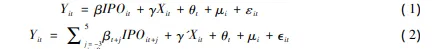 其中,Yit代表企业创新,使用企业的专利申请信息( 整体专利申请量以及发明专利、非发明专利申 请量) 进行衡量。① 解释变量 IPOit表示企业的上市状态,企业上市后为 1,企业上市前和非上市企 业为 0。在( 2) 式中,IPOit被分解为 IPOit + j ,表示距离 IPO 第 j 年( j = - 3,- 2,- 1,0,1,2,3,4,5) 的 虚拟变量,例如: 上市企业上市前一年 IPOit - 1 = 1,其他为 0。为比较上市前后的变化,本文将上市 当年( j = 0) 作为对照的基准。X 为控制变量,包括一系列代表融资约束的指标。IPO 融入大量资 金缓解企业融资约束对企业创新带来正向影响,为识别专利管理效应,需要控制 IPO 带来的融资约 束的变化。现有文献对企业融资约束衡量的指标并没有形成共识,常用的 KZ 指标等各存争议。同时,由于缺乏企业 IPO 前和非上市企业股票市场表现的相关数据,本文没有采用 KZ 指标衡量融 资约束。借鉴 Bellone et al. ( 2010) 和阳佳余( 2012) ,本文将内源资金约束、信贷资金约束、商业信 贷约束、直接融资资金约束等方面的财务指标作为企业融资约束的代理变量,具体包括: 总资产对 数、应收帐款/总资产、固定资产/总资产、资产负债率、流动资产/流动负债和利润率。对连续型控制变量,均做了 1% 的 winsorize 处理。同时,本文还控制了个体固定效应和年份固定效应,并将标 准误差聚类到企业层级。