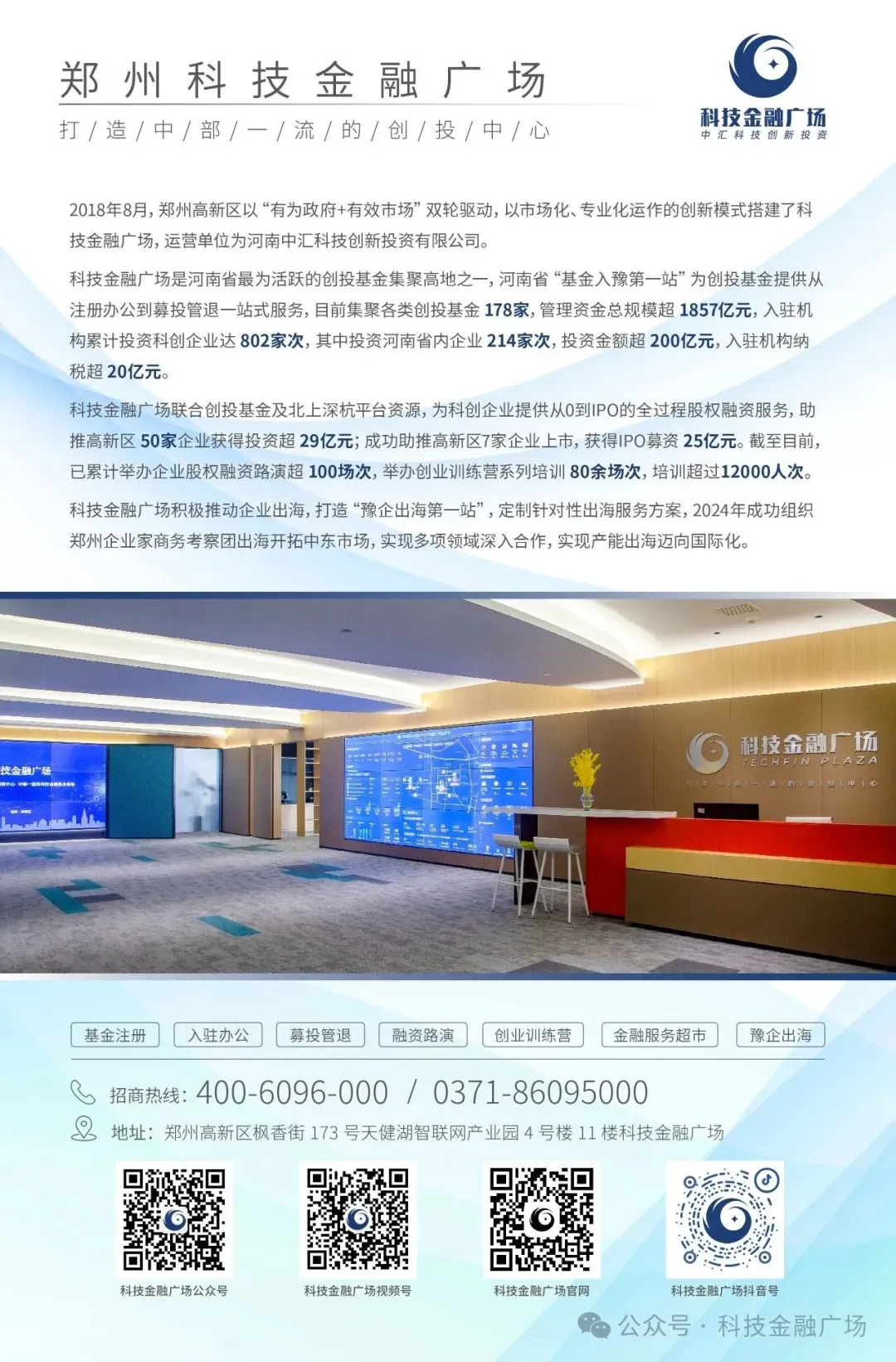 截至目前,科技金融广场已集聚各类创投基金179家,管理资金总规模超1857亿元。入驻机构累计投资科创企业达802家次,其中投资河南省内企业214家次,投资金额超200亿元。