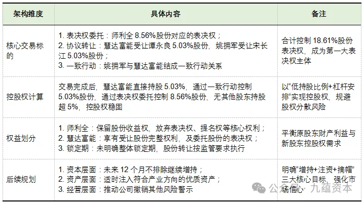 本次交易以“表决权委托+协议转让+一致行动”为核心组合,通过低资金投入实现高比例表决权控制,架构设计兼具灵活性与合规性,具体如下: