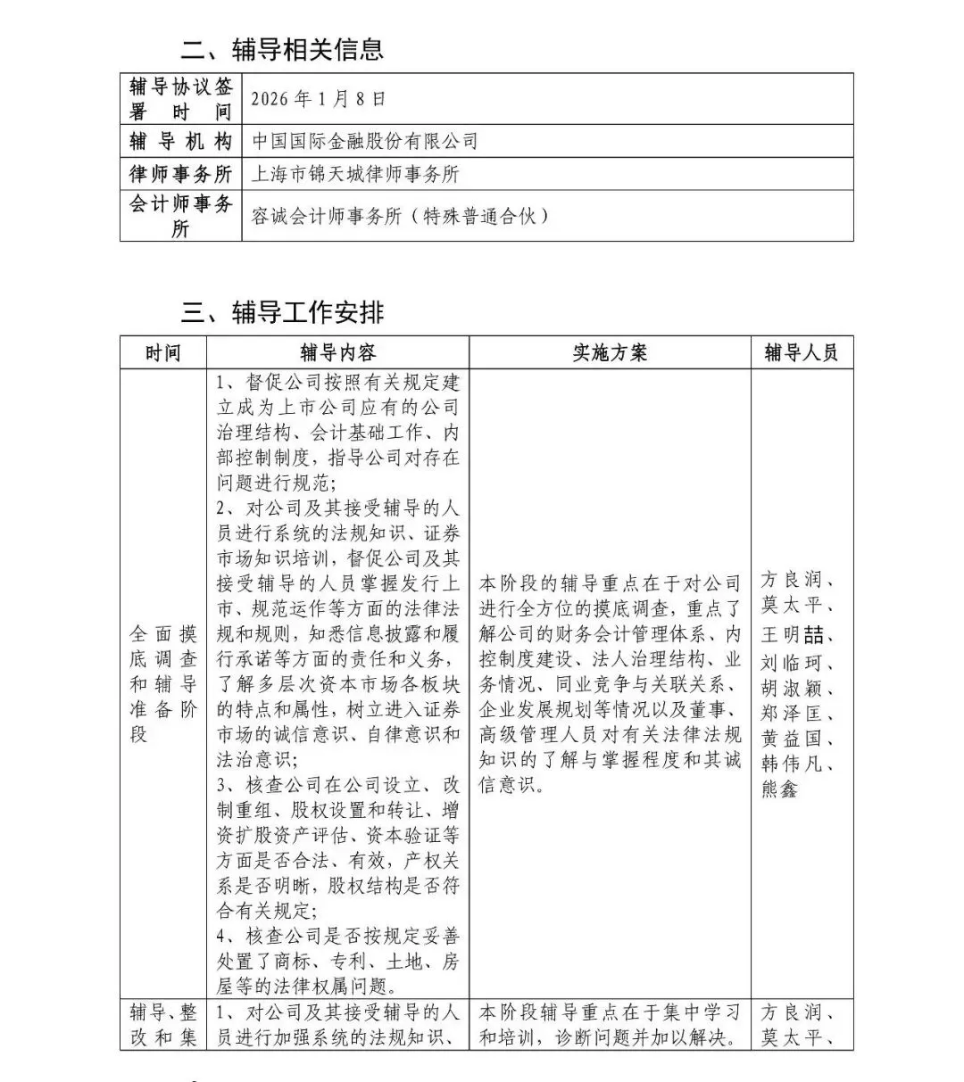 辅导机构为中国国际金融股份有限公司,律师事务所为上海市锦天城律师事务所,会计师事务所为容诚会计师事务所(特殊普通合伙)。