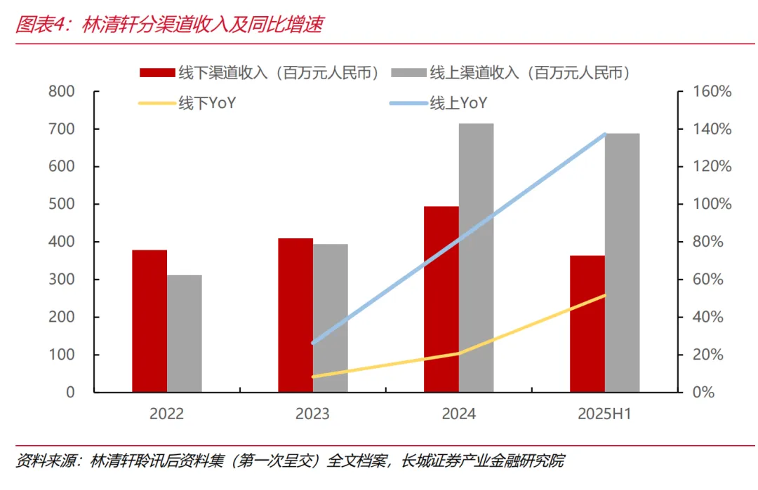 作为中国高端国货护肤品牌,公司主要聚焦抗皱紧致类护肤品市场,以旗下旗舰品牌“林清轩”闻名,该品牌长期专注于提供基于山茶花成分的高端护肤改善方案,开创“以油养肤”理念,首创山茶花面部精华油。2024年公司实现营业收入12.10亿元,同比增长50.27%,经调整净利润2.00亿元,同比增长126.37%。2025年上半年,公司实现营业收入10.52亿元,同比增长98.28%,经调整净利润2.01亿元,同比增长118.26%。立足于山茶花精油,公司领跑国产高端护肤。“林清轩”品牌提供全系列高端护肤改善方案,包括精华油、面霜、爽肤水及乳液、精华液、面膜及防晒霜,支持自清洁及爽肤至保湿及针对性护肤的全套护肤流程;其中山茶花抗皱修护精华油作为公司的核心大单品,自2014年以来持续升级,目前已经推出第五代产品,根据林清轩聆讯后资料集(第一次呈交)全文档案援引灼识咨询的资料,截至2025年6月30日,该产品累计销量已经超过4500万瓶,按照零售额计算,连续11年稳居全国面部精华油产品榜首。从技术路径来看,山茶花抗皱修护精华油采用发酵山茶籽油配制而成,采用分子重组生物发酵技术,这种先进的配方可促进深层细胞年轻化,提供有针对性的抗皱、紧致及肌肤修护功效。我们认为,面部精华油市场空间仍广阔,根据灼识咨询数据,截至2024年,市场规模53亿元,五年间复合增速为42.8%,受到消费者偏好天然成分趋势的影响、伴随着“以油养肤”理念的流行,市场仍有望扩容;公司凭借创新性精油产品率先占领消费者心智。同时,公司进一步将山茶花概念沿用至精华露、面膜、净化水、肌底液等多种产品中,我们认为,此举有望助力公司实现自身突破,在大单品的基础上,进一步丰富产品矩阵,形成更多成长抓手。体验式护肤提升客户体验,线下渠道巩固高端定位,线上渠道持续扩大影响力。公司线下渠道多设立在商业繁华的高端购物商场内,以提升品牌认知度及巩固品牌高端市场定位,并且在门店中提供体验式护肤服务,以提升客户体验,我们认为,公司产品+服务的双重服务有望使得消费者更为直接地体验产品,同时可体验多种产品效果,或对门店销售的转化率、连带率形成一定的拉动作用。截至2025年6月30日,公司在全国拥有554家门店;2025年上半年线下渠道实现收入3.64亿元,占销售收入的34.6%。此外公司通过线上渠道触达更为广泛多样的消费者群体,通过线上直销及线上零售商为消费者提供便利及接触点,2025年上半年公司线上渠道实现收入6.88亿元,占收入的65.4%。二、智能眼镜:CES展AI眼镜产品百花齐放
