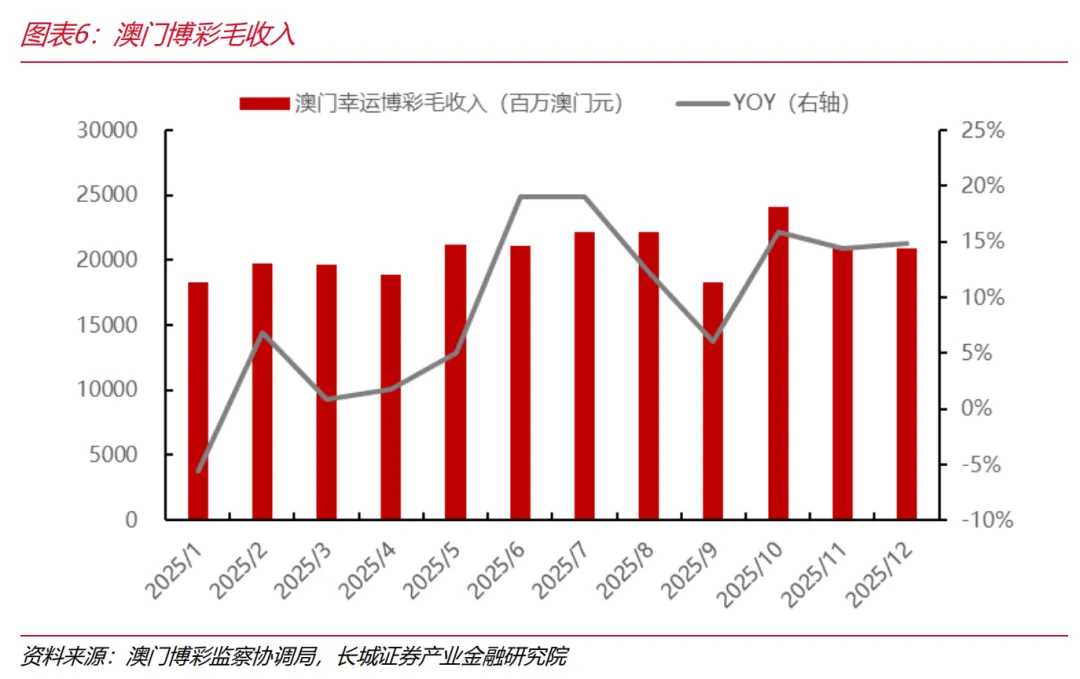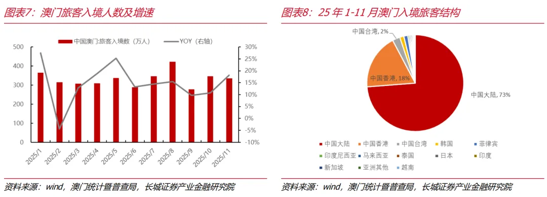 博彩具备顺周期+高端消费属性,当前美国进入降息周期,中国亦推出一揽子经济刺激措施,博彩有望受益于全球流动性增加、经济复苏、财富效应。从25Q2以来,澳门博彩收入持续复苏,25年12月澳门博彩毛收入209亿澳门元,同比+15%,恢复至2019年同期的91%;25年全年澳门博彩毛收入2474亿澳门元,同比+9%,恢复至2019年同期的85%。澳门入境旅客人数保持双位数增长,8月以来单月入境人数已经超越19年同期水平。25年11月澳门入境旅客人数334.6万人次,同比+18%,恢复至19年同期的115%;25年1-11月澳门入境旅客人数3649万人次,同比+14%,恢复至19年同期的100%。从旅客结构来看,25年1-11月游客来源占比最高的为中国大陆、中国香港、中国台湾,占比分别为73%、18%、2%,其余国家/地区占比都较小。风险提示:行业竞争加剧风险、原材料价格波动风险、国内消费修复不及预期风险、海外需求波动风险、贸易政策及关税风险、汇率波动风险