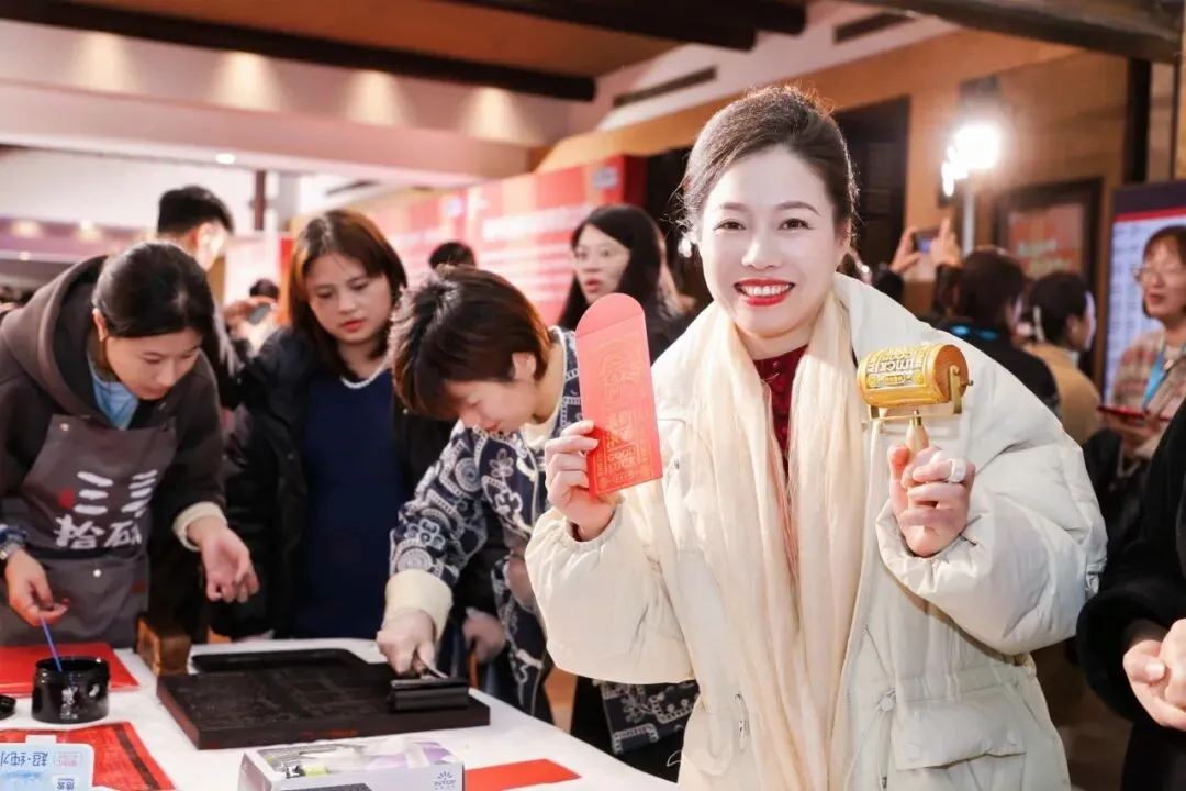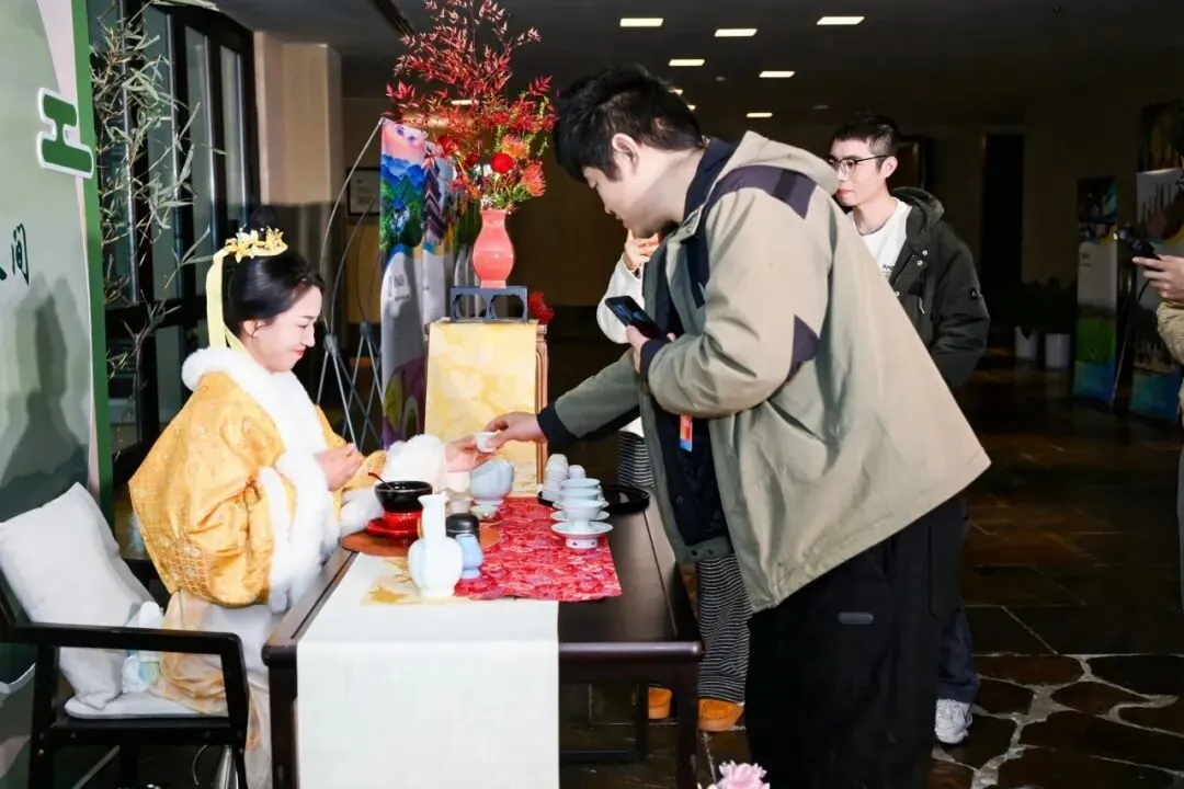 会场外设置的余杭文旅互动展示区成为亮点。“余杭好物”展区集中展示了余杭特色文创产品和科技新特产,余杭纸伞、蓝染套装、径山禅茶礼盒等产品精巧亮眼;而AI力量健身器、夸克AI眼镜等文旅科技产品吸引来宾驻足体验,尽显余杭“文旅+科技”的独特魅力。径山点茶展台,茶艺师娴熟运用宋代茶筅击拂出细腻的“雪沫乳花”,向与会来宾娓娓道来源远流长的禅茶故事。还有现场制作的雕版印刷可直接将余杭非遗“带回家”;同时“会见余杭”展区汇集了余杭优质会议会展资源,为企业未来的活动提供贴心选址参考。