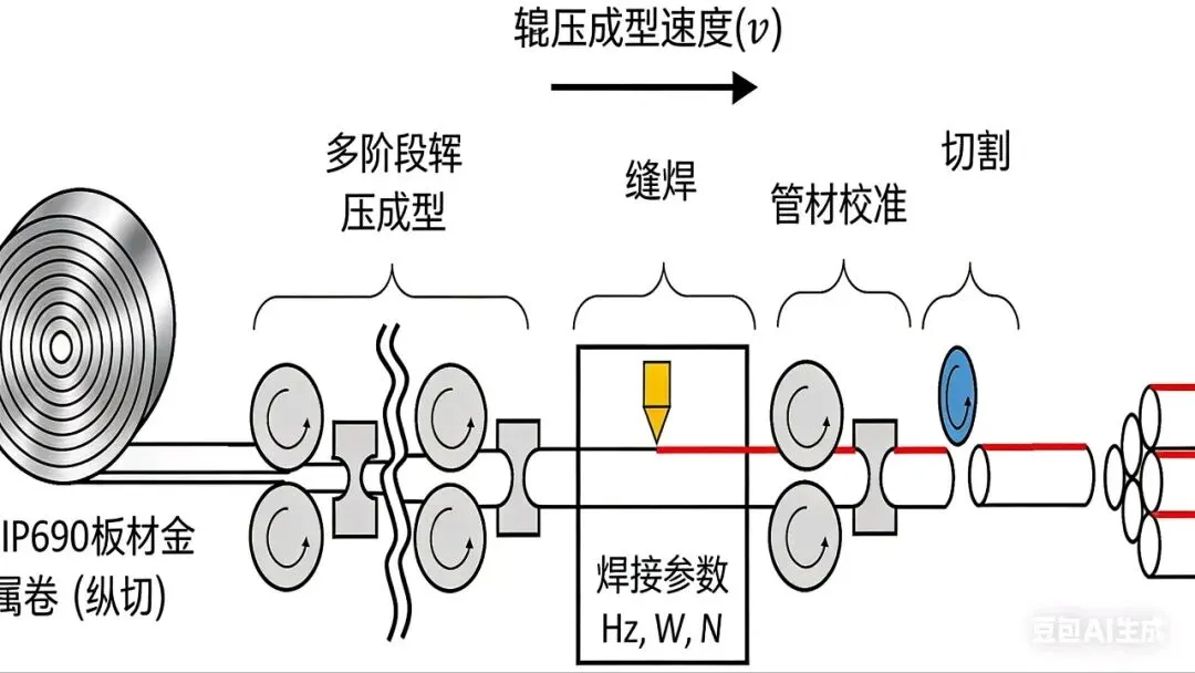 一条典型的无缝钢管焊接生产线主要由 开卷展平、成型、焊接、精整定径 四大核心工艺模块构成,并辅以 强大的电气控制和辅助系统。其生产流程为:开卷 → 展平 → (头尾对焊)→ 多道次成型 → 高频焊接 → 去毛刺 → 冷却 → 定径 → 矫直 → 定尺切割。