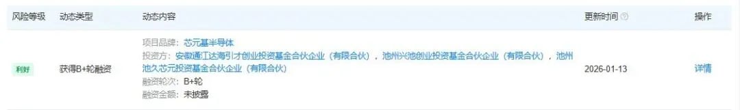 根据天眼查APP于1月7日公布的信息整理,上海芯元基半导体科技有限公司B+轮融资,融资额未披露,参与投资的机构包括金桥基金,泥藕资本,创谷资本。