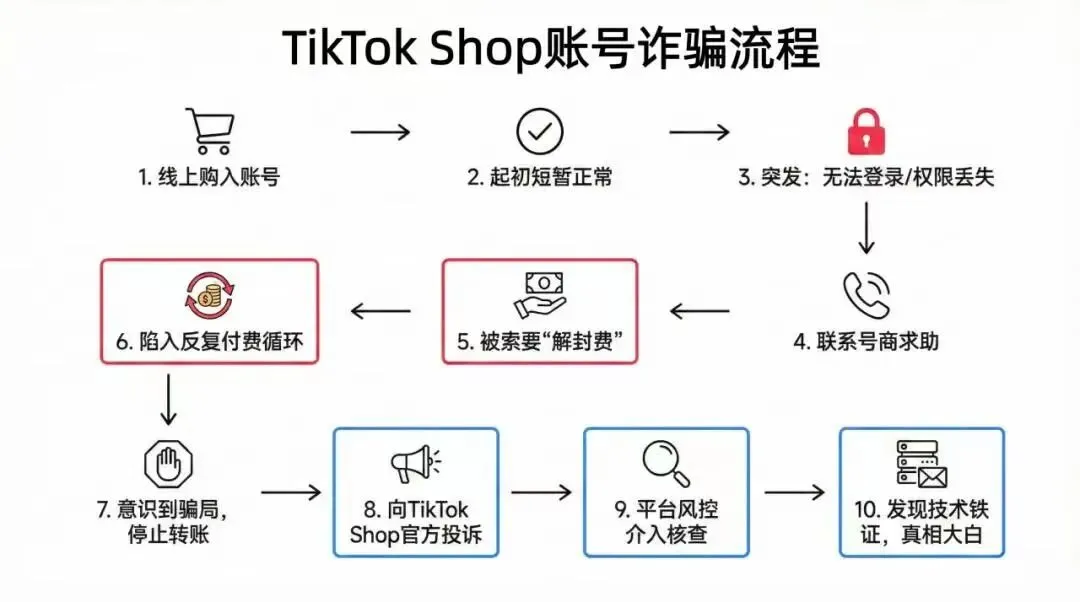 他先是在网上把账号卖给受害商家,转头就联系这个账号的原始注册人进行账号找回。当受害商家发现账号登不上时再以“协助找回账号”为名收取技术服务费,形成了“账号倒卖—反向找回—重复收费”的诈骗模式。