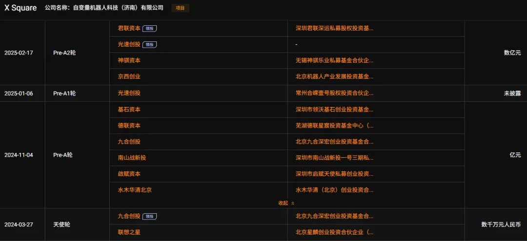 据执中ZERONE统计,截至目前,自变量机器人已累计完成至少7轮融资,累计融资约30亿元,除上述机构外,自变量机器人背后还聚集了光速光合、君联资本、华映资本、云启资本、基石资本、广发信德、联想之星等多家机构。
