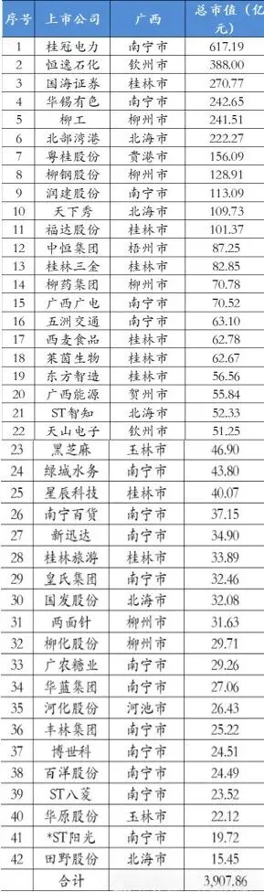截至2025年最后一个交易日收官,A股上市公司5470家,总市值119万亿。(台湾未列入)从市值看,万亿以上数量有12家,1000亿至10000亿有164家,500亿至1000亿有184家,200亿至500亿有625家,100亿至200亿有932家,50亿至100亿有1466家,30亿至50亿有1222家,20亿至30亿有637家,10亿至20亿有218家,10亿以下有10家。其中市值万亿的12家企业里央、国企9家,民企3家。从地区看,粤、浙、苏、京、沪为前5名,家数分别为890、731、721、481、452,占A股上市公司总数60%;从地区总市值来看,前5名为京、粤、沪、浙、苏,市值分别为30.6万亿、19.3万亿、10.9万亿、9.2万亿、8.9万亿,占A股总市值66%。截至2025年最后一个交易日收官,A股广西42家上市公司总市值3907亿元,总市值在全国各省中排第27。42家上市主体在全国排名第21位,上市主体数量排名与GDP在全国排名有差异。上市企业平均市值93亿,为A股上市企业平均市值217亿的43%。广西无市值千亿级别公司,达到A股上市企业平均市值(217亿元)的仅有6家。另市值100亿元以下31家,市值50亿元以下公司19家。从广西设区市分布看,南宁16家,桂林8家,柳州、北海各5家、钦州、玉林各2家,贵港、梧州、贺州、河池各1家,百色、来宾、防城港、崇左4市剃光头。另外,这42家上市公司中的股本属性就不逐一分析。比如,广西市值规模300亿以上公司有2家,其中桂冠电力市值617亿,大唐集团为该公司控股股东;恒逸石化市值388亿,为浙江恒逸集团子公司。一个央企,一个民企。从商业史看,上市公司目前依旧还是一种高度发达、科学可靠的生产组织方式,区域上市公司的数量及运营质量在很大程度上真实反映了当地的治理水平与发展质量。当然,目前上市公司治理中也存在很多问题。“自觉'站在天安门城楼'思考谋划广西工作,不折不扣推动党中央重大决策部署在广西落地生根、开花结果。”这句话的含金量还在上升......