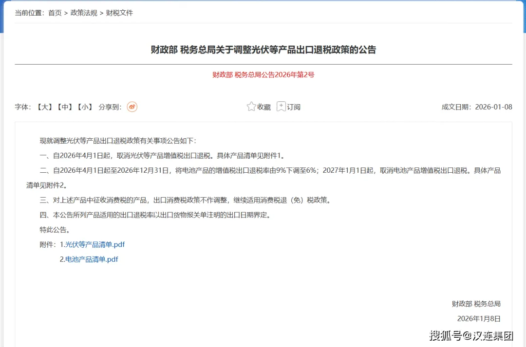 2026年3月初,财政部、税务总局联合发布2026年第2号公告,明确自2026年4月1日起,取消光伏、陶瓷等产品增值税出口退税。