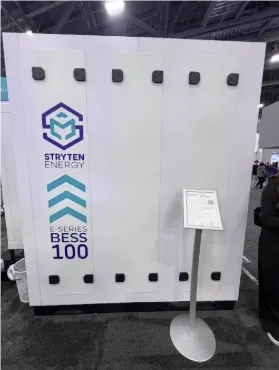 在展会上,Stryten Energy展示了多项公用事业规模和工业级技术。其中一项展出的技术是其领先的电池储能系统(BESS),例如下图所示的E系列BESS 100。该公司还展示了其钒液流电池(VRFB)技术,该技术可提供不可燃的储能,放电持续时间从5小时到24小时以上不等。最后,Stryten还展示了一款锂电池移动微电网,这是一款柴油-电力混合动力汽车,集成了专有软件,用于管理和存储来自各种能源的能量。