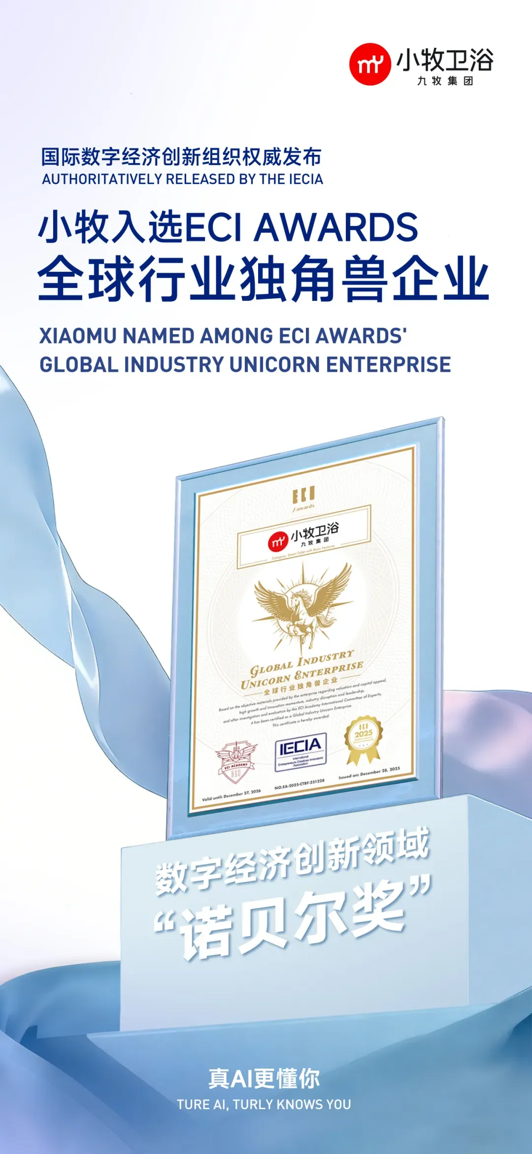 本次奖项由国际数字经济创新组织IECIA(国际艾奇奖组委会)发起并评审。ECI Awards作为全球首个以“创新的有效性”为评价标准的数字经济国际奖项,被誉为数字经济创新领域的“诺贝尔奖”。该奖项旨在表彰在技术、产品、商业模式等方面具有显著创新贡献与商业价值的个人与组织。小牧卫浴此次获奖,不仅标志着其创新实力获得国际权威认可,也象征着中国智造在全球数字经济舞台上的又一次精彩亮相。