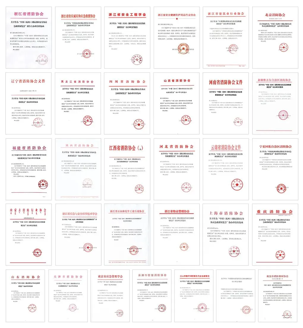 协办单位:浙江省防灾减灾和应急救援协会、浙江省安全工程学会、浙江省安全健康防护用品行业协会、浙江省防爆电气行业协会、浙江省建筑行业协会、浙江省石油和化学工业行业协会、浙江省物业管理协会、浙江省建筑业技术创新协会、陕西省消防协会、福建省消防协会、河北省消防协会、江西省消防协会、云南省消防协会、辽宁省消防协会、黑龙江省消防协会、四川省消防协会、上海市消防协会、重庆消防协会、天津市消防协会、内蒙古消防行业协会、山东省消防协会、河南省消防协会、新疆消防协会、宁夏回族自治区消防协会、乐清市智慧消防协会、江山市数字消防新生代企业家联合会、南安市消防器材协会、粤港澳消防安全协会、北京环球优路教育科技股份有限公司