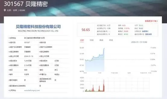 贝隆精密成立于2007年,2024年1月在深交所创业板上市(股票代码:301567.SZ),总部位于浙江余姚,专注于高精度精密结构件的研发、生产与销售,产品具备固定、支撑、散热、连接、防护等核心功能,广泛应用于智能手机、可穿戴设备、智慧安居及汽车电子等领域。截至2026年1月13日,公司总市值36.72亿元,市盈率(TTM)124.41倍,市净率4.91倍,估值水平显著高于行业均值。