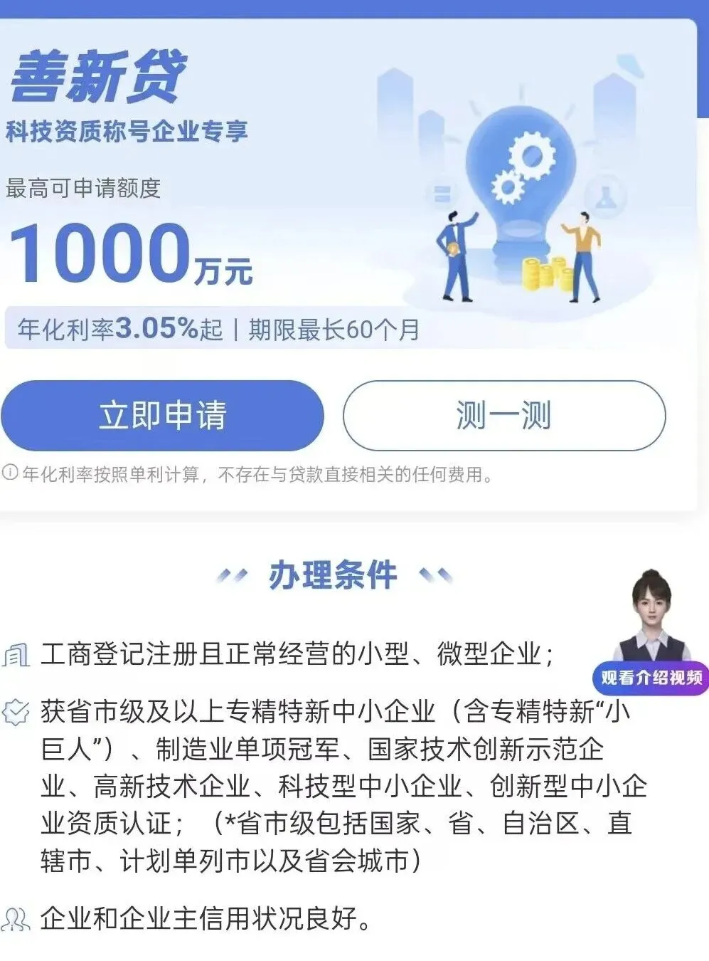 善新贷进一步扩大了客户范围,除了原本的专精特新企业、高新技术企业等,新增了制造业单项冠军及国家级科技示范企业等标签的准入。这意味着更多优质企业有机会申请善新贷,获得资金支持。