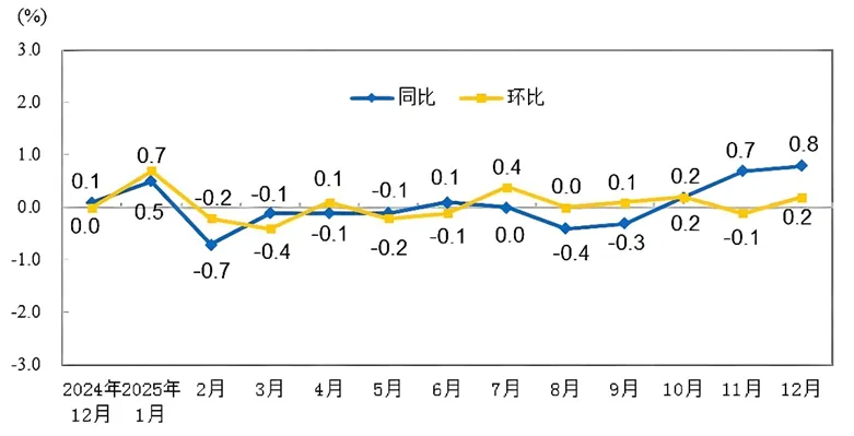 2025年12月份,全国居民消费价格同比上涨0.8%。其中,城市上涨0.9%,农村上涨0.6%;食品价格上涨1.1%,非食品价格上涨0.8%;消费品价格上涨1.0%,服务价格上涨0.6%。2025年全年,全国居民消费价格与上年持平。