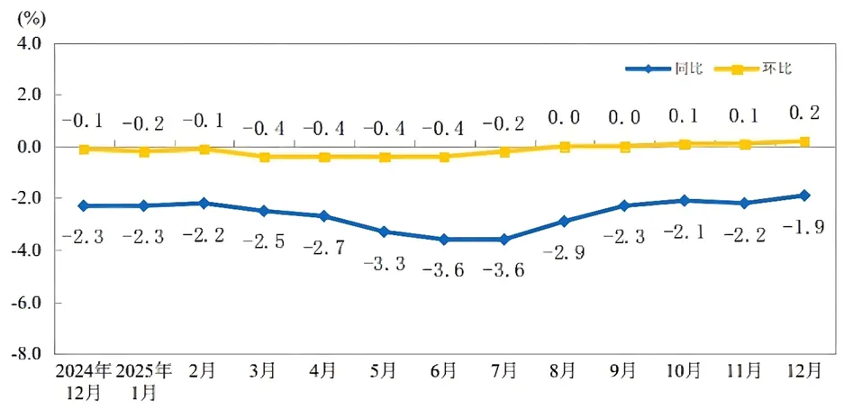 2025年12月份,全国工业生产者出厂价格同比下降1.9%,降幅比上月收窄0.3个百分点;环比上涨0.2%,涨幅比上月扩大0.1个百分点。工业生产者购进价格同比下降2.1%,降幅比上月收窄0.4个百分点;环比上涨0.4%,涨幅比上月扩大0.3个百分点。2025年全年,工业生产者出厂价格下降2.6%,工业生产者购进价格下降3.0%。