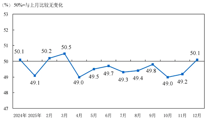 2025年12月份,制造业采购经理指数、非制造业商务活动指数和综合PMI产出指数分别为50.1%、50.2%和50.7%,比上月上升0.9个、0.7个和1.0个百分点,三大指数均升至扩张区间,我国经济景气水平总体回升。