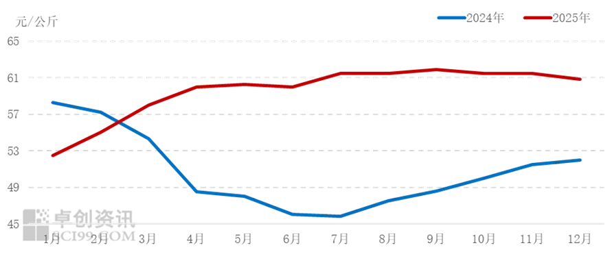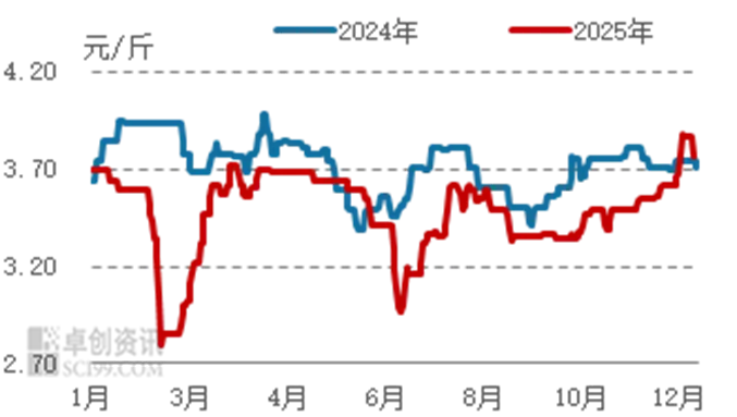 2025年12月生猪价格呈现跌-涨-跌-涨走势,月底涨幅较大。月初,养殖端出栏积极性较高,市场生猪供应充足,而终端需求表现平淡,养殖端多选择降价走量,生猪价格下行。中上旬,随着气温回落,大猪消费需求逐步释放,南方腌腊备货活动启动,终端需求迎来增量,支撑生猪价格止跌回升。下旬冬至过后,南方腌腊备货热度消退,终端需求出现阶段性收缩,生猪价格随之小幅回调。临近月底,养殖端缩量挺价,市场大体重猪源供应出现缺口;下游屠宰企业收购难度攀升,被迫抬价保量,带动生猪价格涨幅进一步扩大。