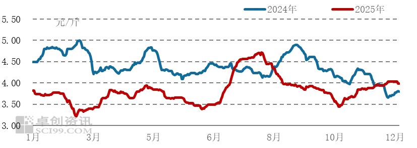 2025年12月白羽肉鸡均价3.67元/斤,较上月上涨0.18元/斤,涨幅5.16%,较去年12月下滑0.05元/斤,跌幅1.34%。12月肉鸡均价呈先涨后降走势,其中12月下旬初毛鸡主流成交价格突破年内历史高点,国内日度均价涨至3.88元/斤。具体来看,12月上中旬受外界天气影响,养殖成活率降低,鸡源偏紧,加之出栏均重降低,供应面利好支撑拉动鸡价上涨,同时产品端同步发力,原料胸肉价格上涨拉动下,鸡价持续走高至年内高位;后期鸡源供应仍旧不多,但产品市场需求放缓,厂家出货速度不快,宰杀亏损情况增加,部分企业陆续开始放假、减量生产操作,需求面主要利空下,肉鸡价格承压高位小幅下滑。整体来看,本月主要受鸡源供应偏紧,叠加需求支撑利多影响,鸡均价环比上月走高。