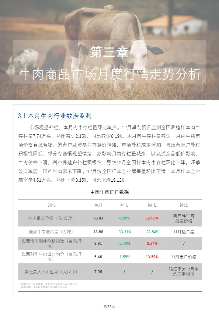 2025年12月国内肉牛市场供需双减,国内肉牛整体呈现下降趋势。本月全国西门塔尔肥公牛交易均价26.66元/公斤,环比下滑0.78%,同比上涨23.43%。供应端来看,市场育肥户积极出栏,上半月市场供应充裕;下半月临近年关,散户出栏积极性较高,市场低质量肉牛集中释放,导致市场主流成交价格重心下移,而好品质肉牛供应一般;需求来看,月上旬屠宰端宰量尚可,部分屠宰端存提量动作,月下旬因国产牛肉销售速度欠佳,进口商年关回笼资金降价销售进口牛肉,以及猪肉等替代品价格下滑,对国产牛肉形成利空影响,屠宰端宰量较月上旬回落。