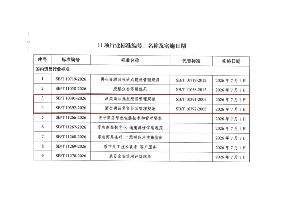 1月16日,商务部发布2026年第5号公告,正式公布包括《酒类商品批发经营管理规范》(SB/T 10391-2026)和《酒类商品零售经营管理规范》(SB/T 10392-2026)两项酒类流通领域标准在内的11项经审核通过的行业标准。公告明确,这两项行业标准将于2026年7月1日正式实施。