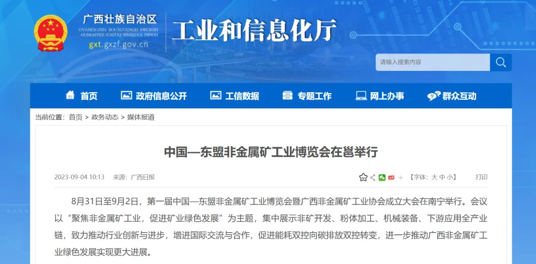 自治区工业和信息化厅网站报道“中国—东盟非金属矿工业博览会在邕举行”。