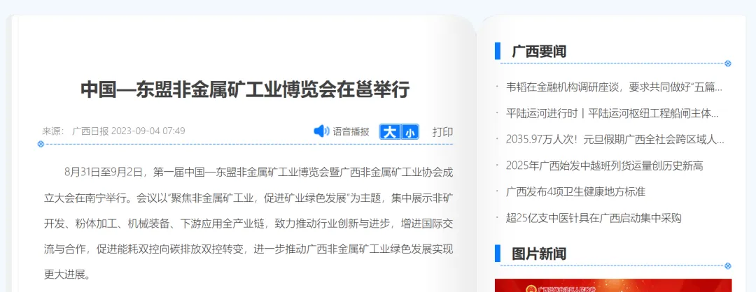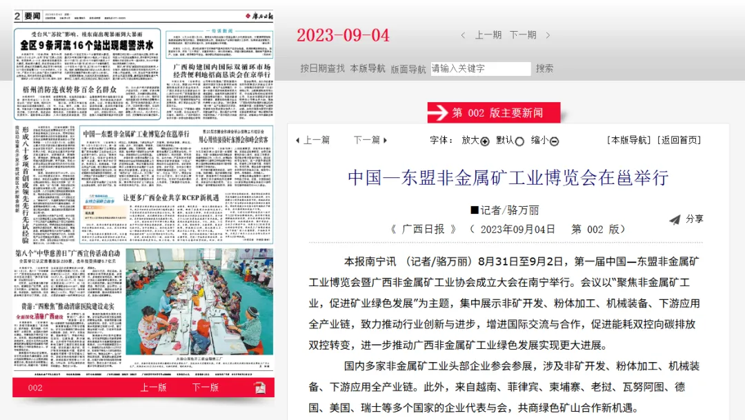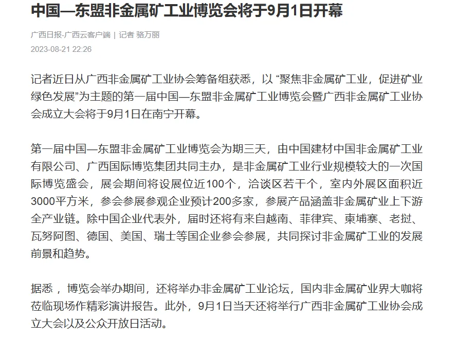 广西日报隆重报道第一届中国—东盟非金属矿工业博览会暨广西非金属矿工业协会成立大会将于9月1日在南宁开幕