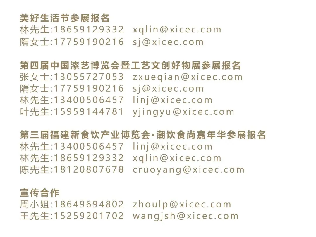 本届福博会将以“福”文化为内核,以“福消费”为场景,持续构建“十福”展区体系,全景式呈现从源头好物到智造精品、从国潮风尚到艺术生活的完整福品生态。设置“美好生活节”与两大专业子展——“第三届福建新食饮博览会·潮饮食尚嘉年华”及“第四届中国漆艺博览会暨工艺文创好物展”,共同打造一个集商贸对接、品牌传播、趋势发布与沉浸体验于一体的高品质盛会。