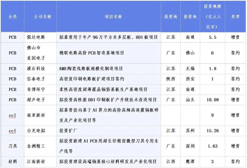 表1 2025年12月国内新增PCB及相关投资项目