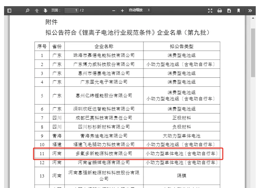 多氟多新能源入选工信部《锂离子电池行业规范条件》企业名单