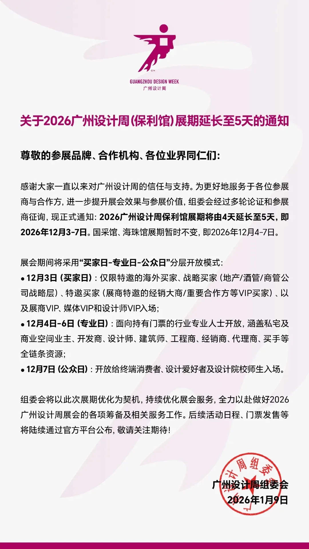 值得一提的是,目前展会优化已持续落地中——2026广州设计周(保利馆)展期正式从4天延长至5天,即12月3-7日,以“买家日+专业日+公众日”的分层模式,实现精准对接与全民共享的双重价值,详情可点击通知图片了解: