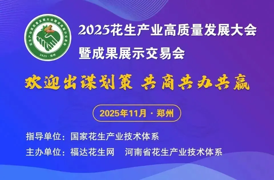 产业振兴,科技先行。作为我国重要的油料和经济作物,花生产业的高质量发展关乎国家粮油安全与乡村振兴。为深入探讨花生产业发展方向,展示最新科技成果,推动产业链协同发展,2025花生产业高质量发展大会暨成果展示交易会将于11月15日-17日在郑州中原国际博览中心隆重召开!