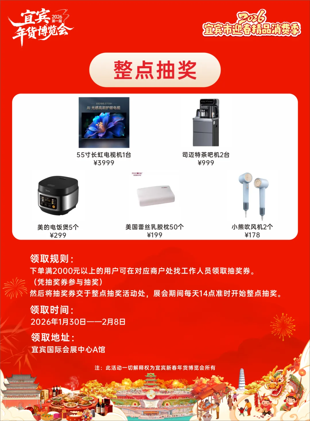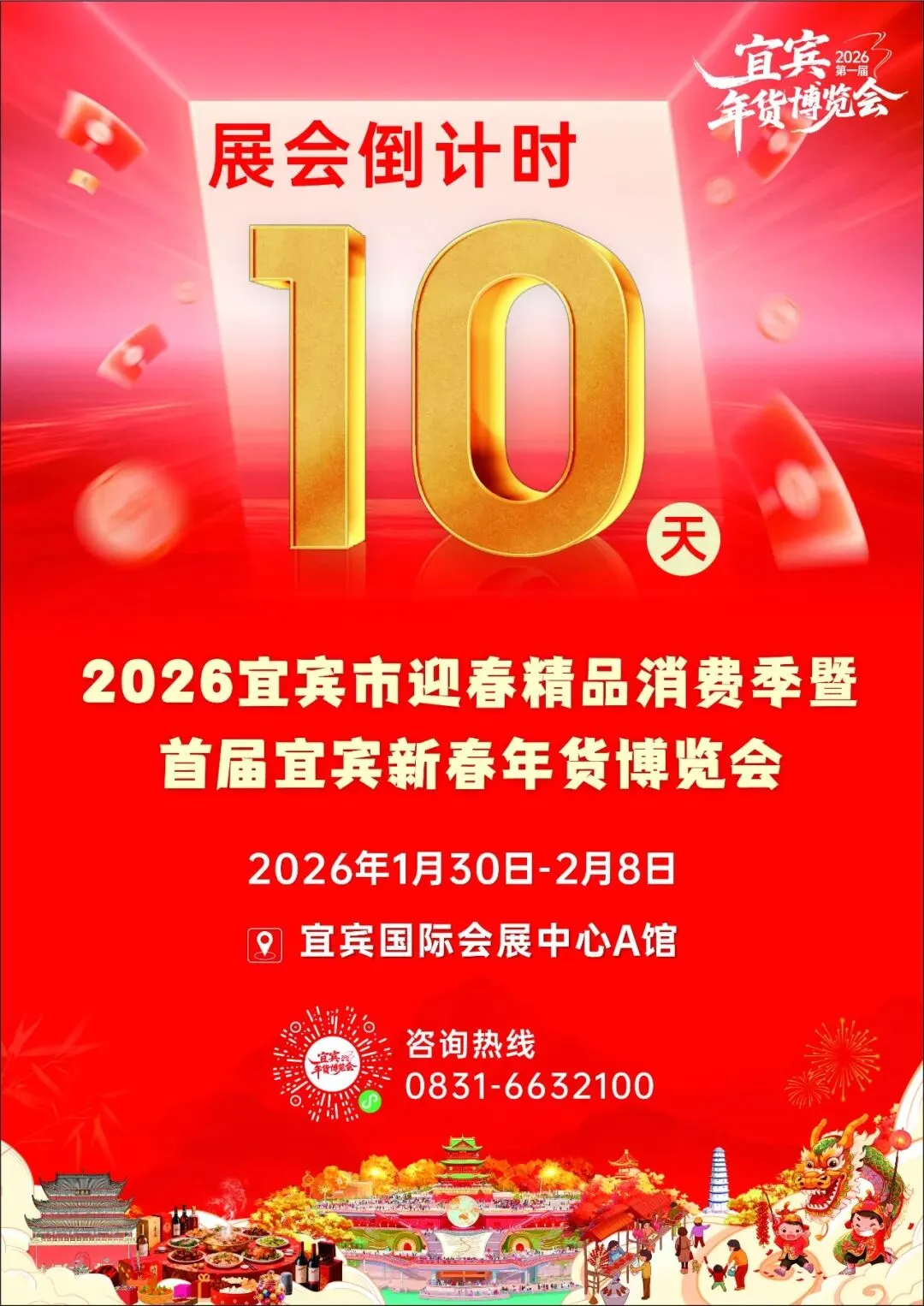 还有10天!宜宾人最期待的新春盛会要来啦!“2026宜宾市迎春精品消费季”暨2026首届宜宾新春年货博览会,1月30日至2月8日将在宜宾国际会展中心热力启幕!2万平方米超大场地、200多个优质摊位、上千个知名品牌,再加上3000万消费政策 “大礼包”,不管是囤年货、品美食,还是赏年俗、抽大奖,这里都能满足你,让你一站式解锁浓浓的新春年味!