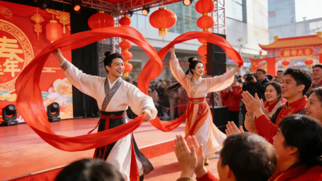 白天的广场舞台同样热闹非凡!主持人活力暖场,瞬间点燃全场气氛;火技表演惊险刺激,每一个动作都让人屏住呼吸;歌手献唱经典新春曲目,熟悉的旋律唤起满满年味;长绸舞飘逸灵动,如行云流水般优美;变脸绝技变幻莫测,一秒切换脸谱,让人惊叹不已;还有书法老师现场挥毫写春联、送福字,笔墨飘香间传递新春祝福,6大节目轮番上演,氛围感直接拉满~