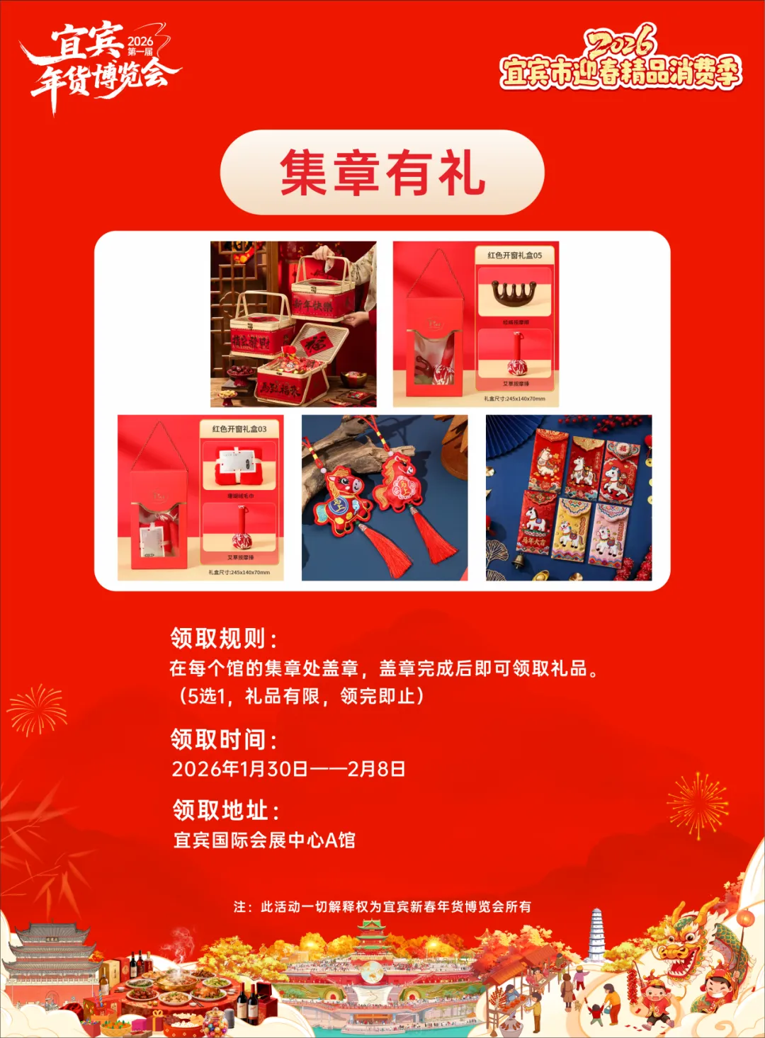 在A1、A2、A3馆集章处参与新春小游戏完成盖章,即可到指定区域兑换红色开窗礼盒(5选1),礼盒精致实用,礼品有限,领完即止,边逛边集章,解锁额外惊喜~