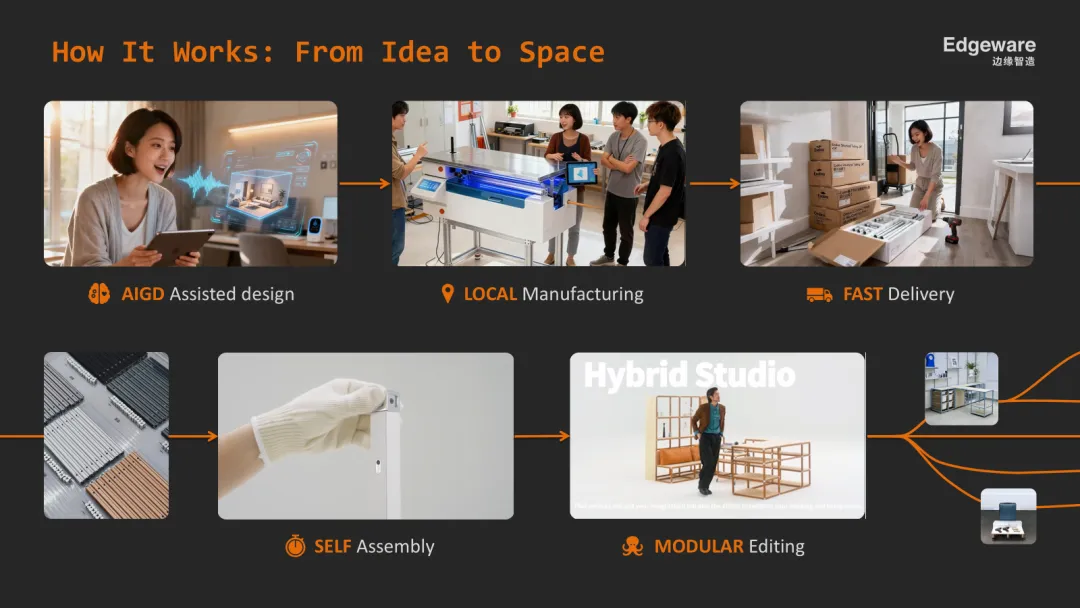 边缘智造构建的 AIGD (Artificial Intelligence Generated Design) 系统,让空间的编辑性能无缝转化为用户的创造能力——从灵感捕捉、方案草图到场景生成的全过程,均可通过AI与人协作的模式高效完成。
