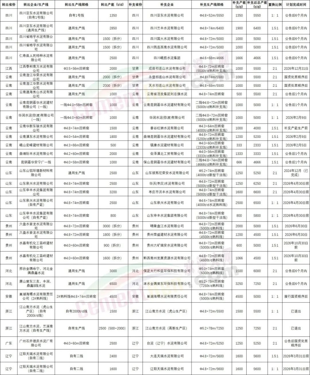 金隅冀东、海螺集团等龙头同样表现突出:涞水金隅冀东整合唐山冀东三友、丰润等多地产能6500吨/日,补充后产能达7250吨/日,强化京津冀区域核心竞争力;巢湖海螺水泥通过两条熟料线合并补充,总补充产能4500吨/日,依托内部产能调剂实现高效置换,体现龙头企业的资源统筹能力。