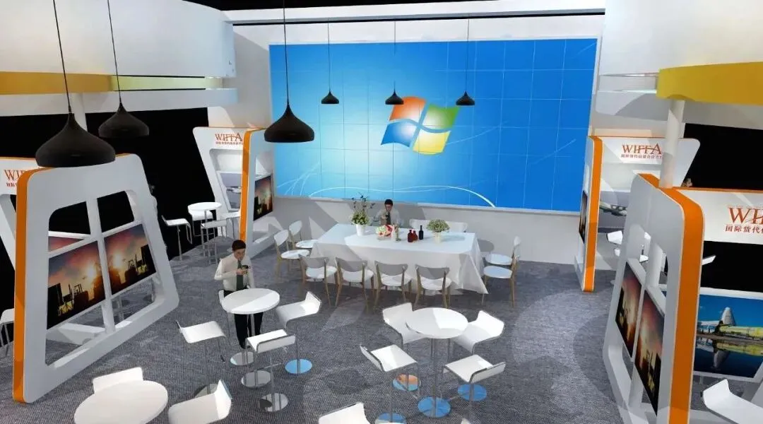 WIFFA展位还开设公共接待区、公共洽谈区和公共签约区,展位正中央有6x4米巨幅LED大屏幕,用于播放WIFFA参展公司多媒体和现场直播、现场签约和现场论坛。