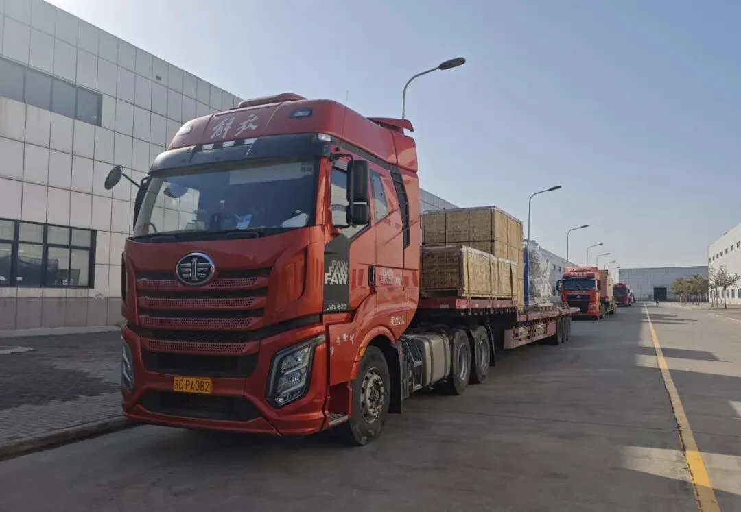 随着鸣笛声响起,一辆辆货车稳步启程,奔赴客户现场。新迈项目涤纶生产线的顺利发运,有力推进了郑纺机一季度生产进度,为实现季度目标注入强劲动力。