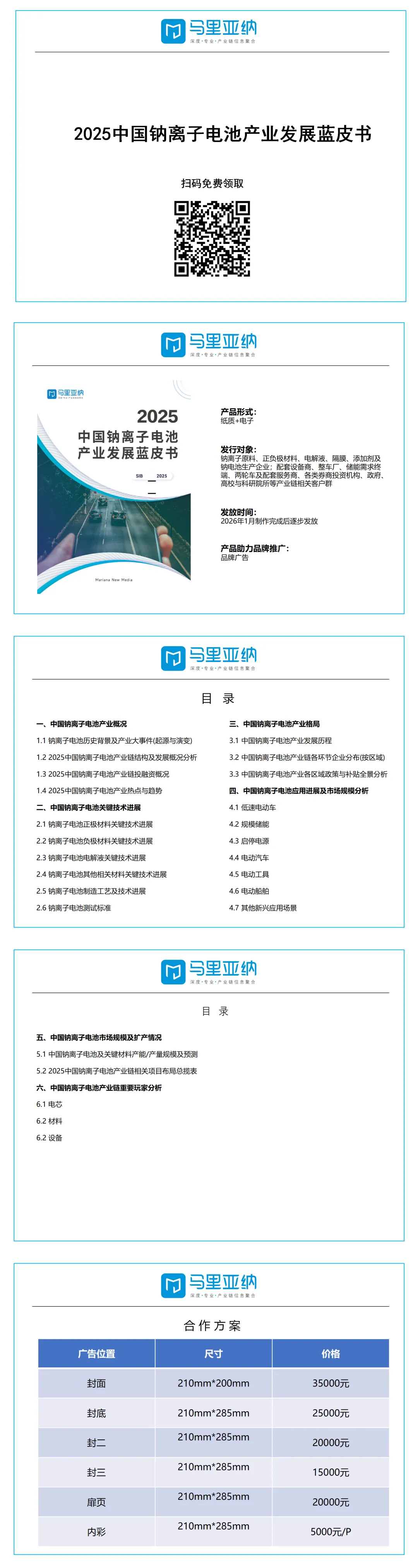 为此,马里亚纳联合广东海四达钠星技术有限公司、安徽青钠能源科技有限公司、广东扬广科技有限责任公司、浙江钠创新能源有限公司、上海璞钠能源科技有限公司、贝特瑞新材料集团股份有限公司、武汉天钠科技有限公司、广东容钠新能源科技有限公司、苏州云栖谷智能系统装备有限公司、东莞市亿富机械科技有限公司等产业链领军机构编撰了《2025中国钠离子电池产业发展蓝皮书》,旨在为行业提供一份全景式的发展指南与未来路标。不仅是对过往成就的总结,更是一个面向未来、持续更新的产业开放平台。
