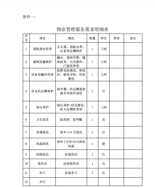 3.服务内容:校园内保洁服务、资料档案管理、公共设施设备维护维修、绿化养护等各项服务。