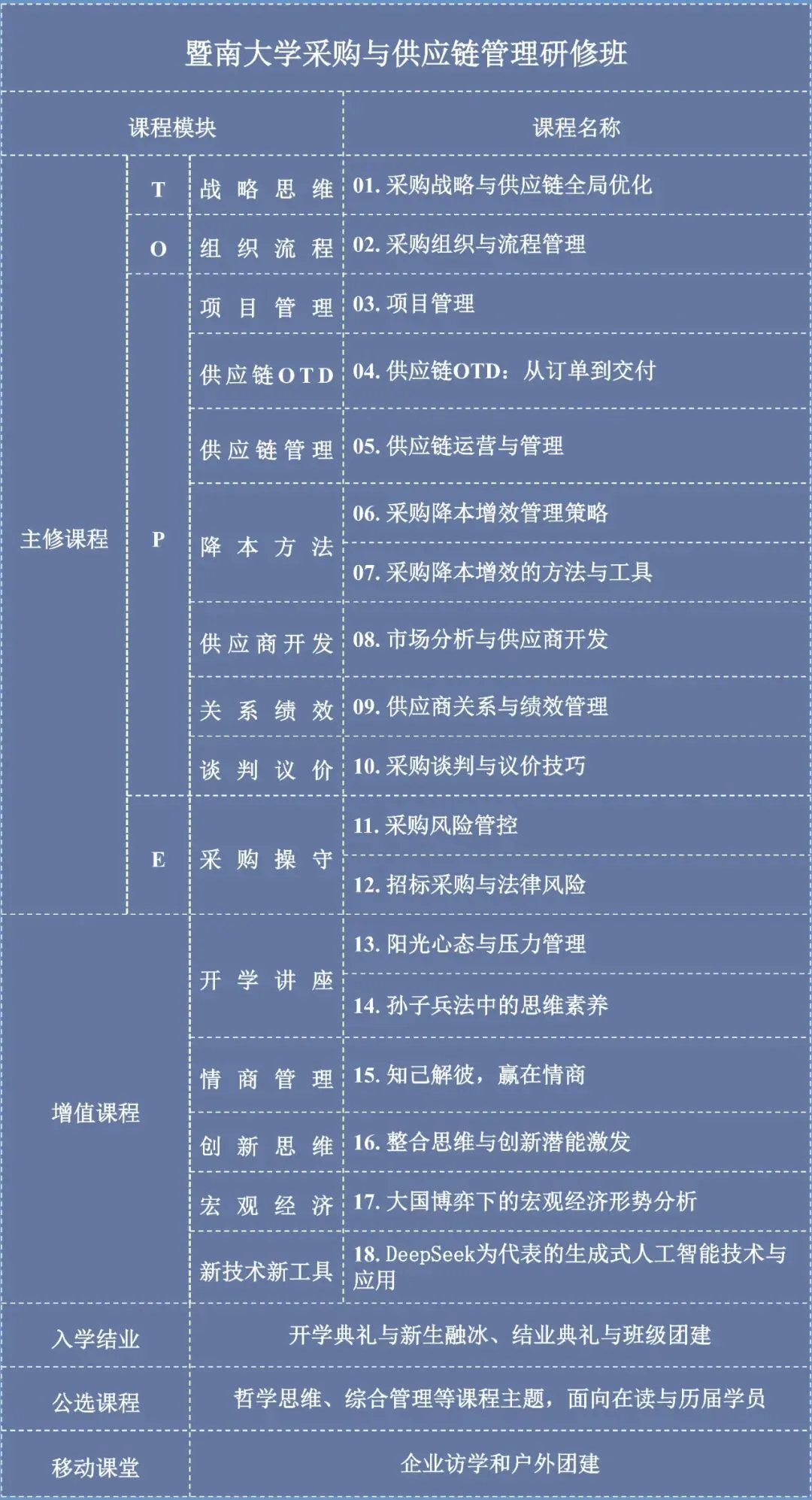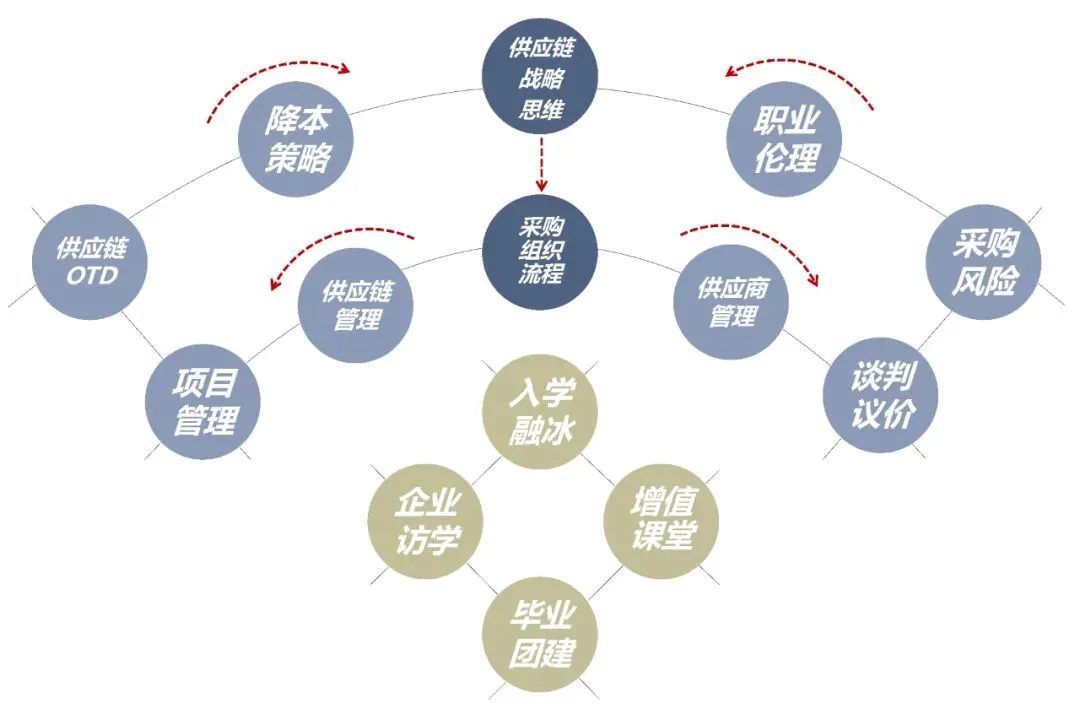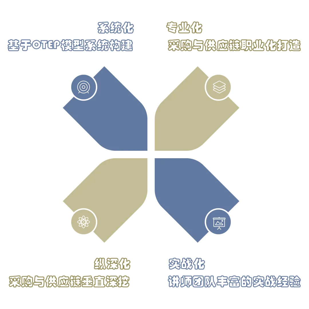 课程体系根据企业采购与供应链运营所需的核心技能,依据OTEP模型展开,OTEP模型是一种现代企业采购与供应链管理方法,基于企业成本与竞争需要,从企业整体优化出发,通过采购组织O(Procurement organization)、采购思维T(Procurement thinking)、采购绩效P(Procurement performance)与采购操守E(Procurement ethics)四个维度,来构建采购与供应管理体系与人才团队。
