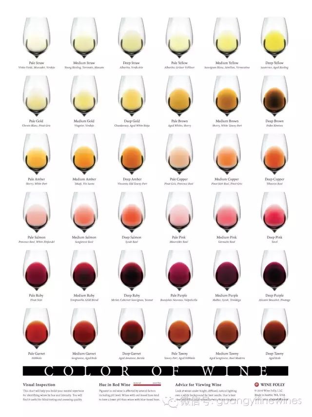 以下是36种典型的葡萄酒图谱,包括红酒、玫瑰红和白酒。依据的是葡萄酒的色调和浓度。我们根据这个图谱就可以对照练习并逐渐掌握我们手里正在品鉴葡萄酒的基本情况。
