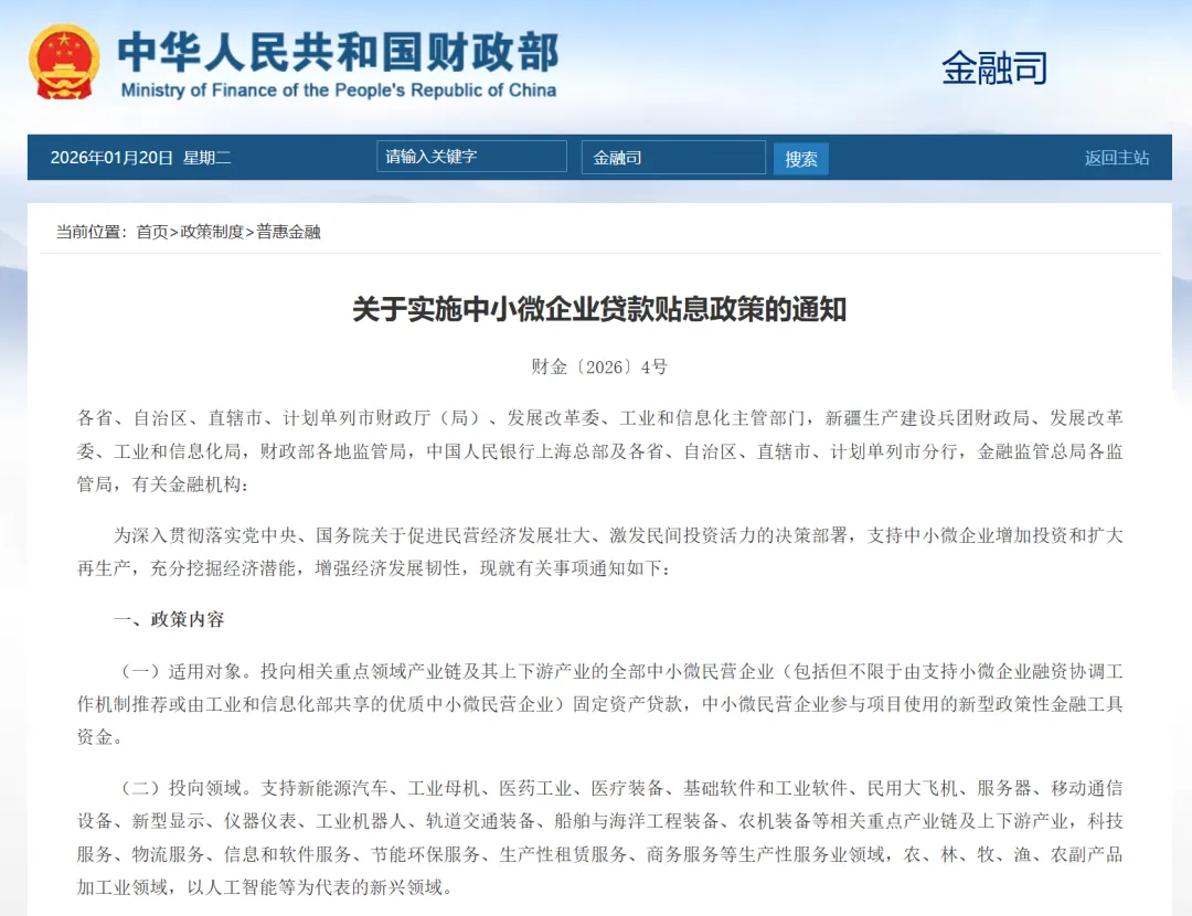 1月20日,财政部、国家发展改革委、工业和信息化部、中国人民银行、金融监管总局等五部门联合印发《关于实施中小微企业贷款贴息政策的通知》(财金〔2026〕4号),支持中小微企业增加投资和扩大再生产,充分挖掘经济潜能,增强经济发展韧性。政策支持领域涵盖支持工业母机、基础软件和工业软件、服务器、移动通信设备、工业机器人等相关重点产业链及上下游产业,科技服务、信息和软件服务等生产性服务业领域,以人工智能等为代表的新兴领域。详细信息如下: