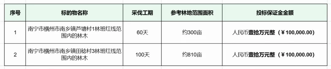 标的物名称、采伐工期、参考林地范围面积、投标保证金金额等见下表: